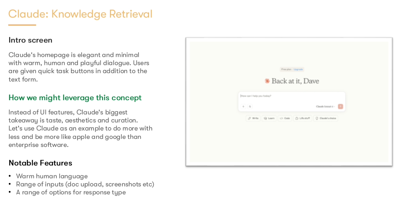 Competitive Analysis: We looked at best in class tools like CoPilot, ChatGPT, Claude and Perplexity to analyze how they perform knowledge retrieval, content generation and task management.